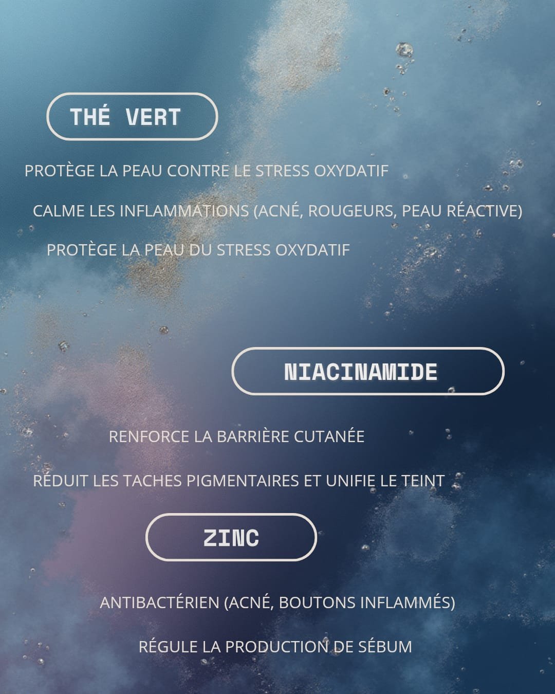 - Le Zinc, reconnu pour son action purifiante et équilibrante, aide à réguler l’excès de sébum et à limiter les imperfections.