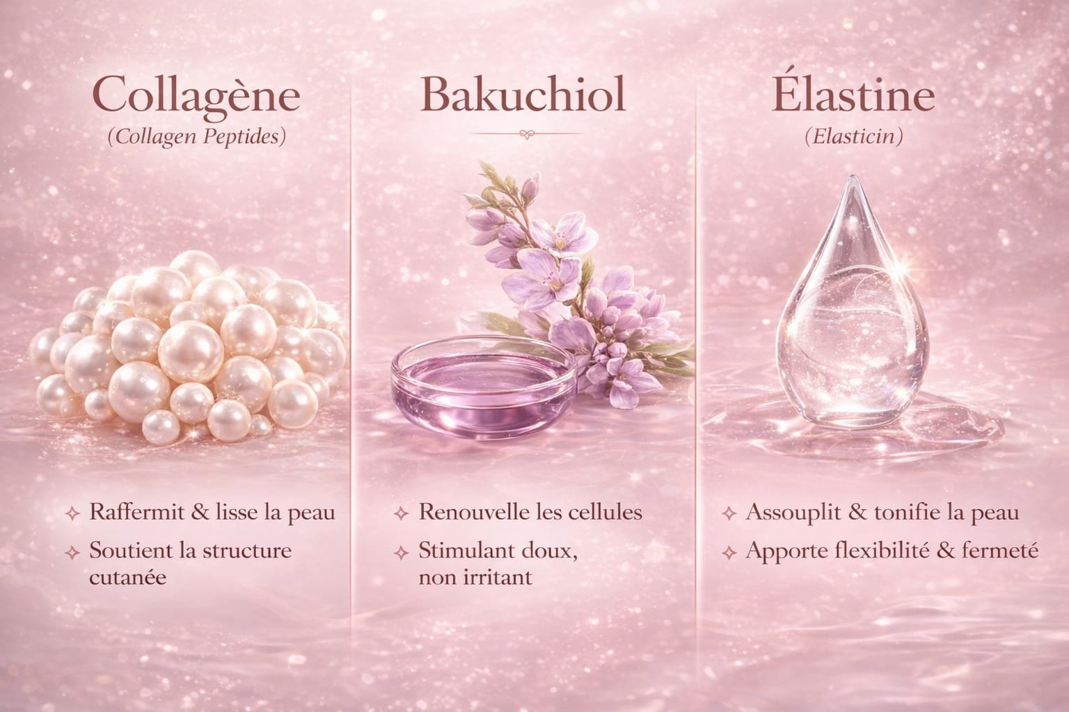Sa formule hautement travaillée associe trois actifs emblématiques de la jeunesse cutanée : Collagen-Peptides, Bakuchiol et Elasticin, sélectionnés pour leur efficacité ciblée et leur excellente tolérance.